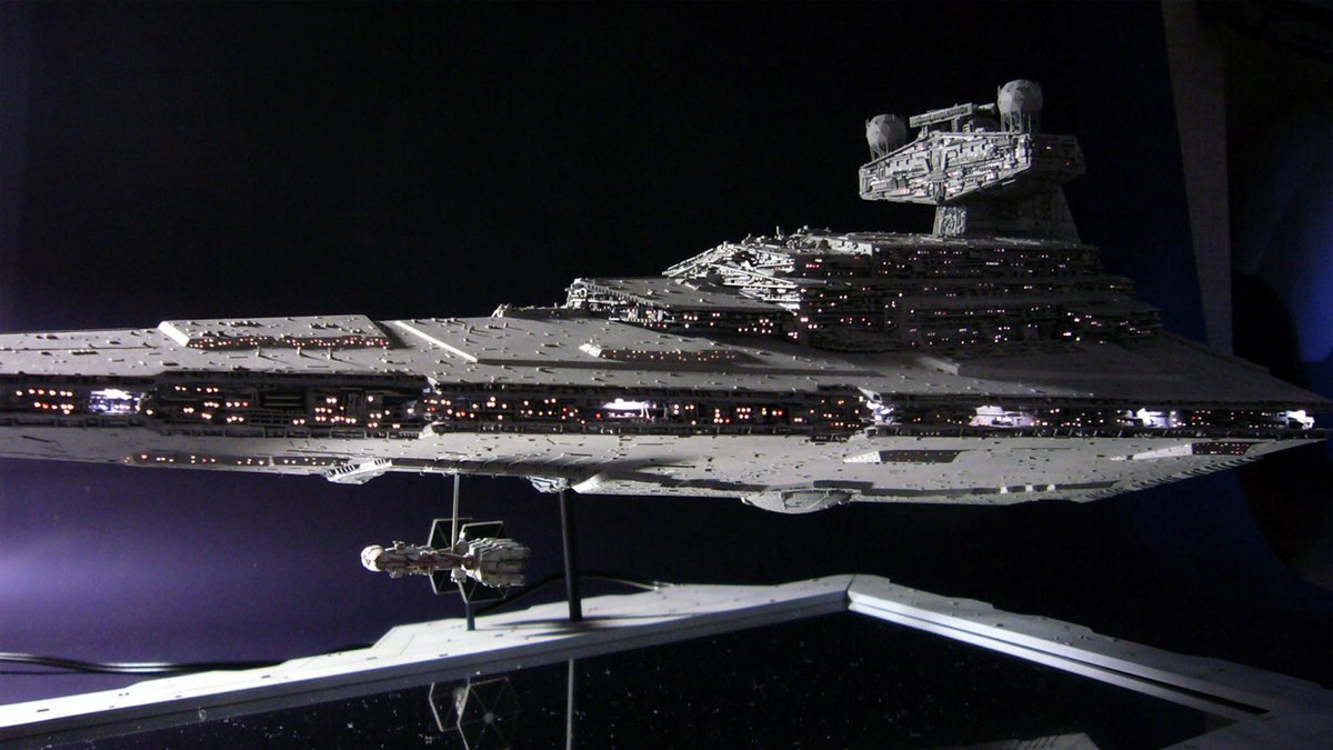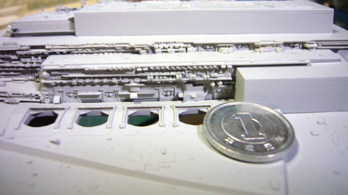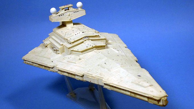 #これ作るの大変でしたプラモ mpc スターデストロイヤー ・当時はこれしかキットが無かったのです ・凸モールドをすべて削り取り ・画像を見ながらプラ小片で再現していく ・電飾も仕込んで1年掛かりで完成 ModelGraphix誌でライターデビュー作となりました(*^^)v