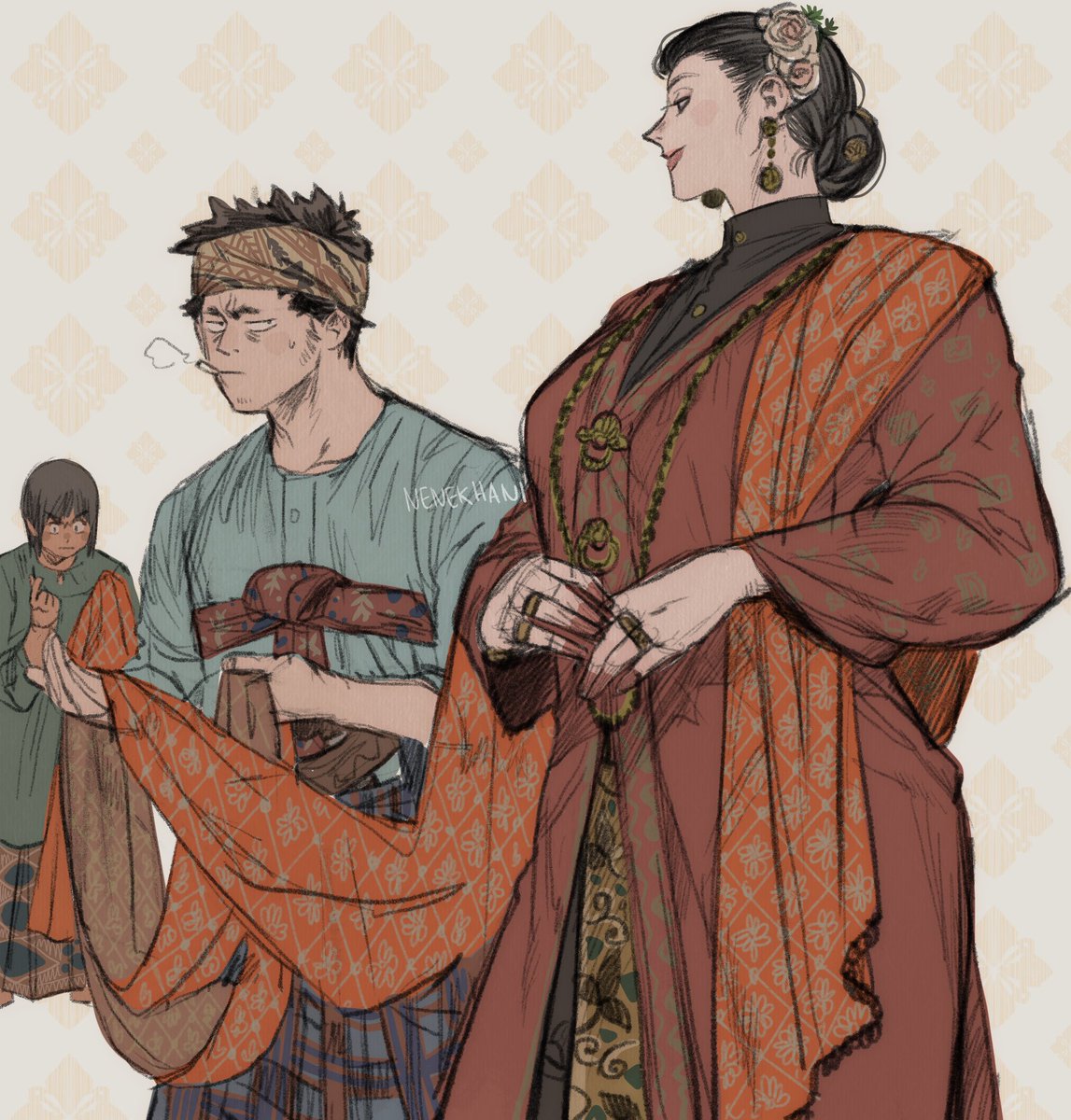 #artistsontwitter is trending ahem Hiii I'm Nenek Hani and I draw big buff Malay women in a project called Witches of the Archipelago. I like beefy men and women, villains doing mundane chores and crying over drawing batik and songket pattern by hand. I also have 2 cats👵🏼😺😺