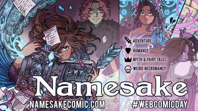 It's #webcomicday! I make those! NAMESAKE - namesakecomic.com is about saving the universe while improvising with portal & phenomenal cosmic powers, necromancy, and a literature degree. Teens + / For fans of Wicked, Kingdom Hearts and Witch Hat Atelier. UPDATE Tues/Thurs.