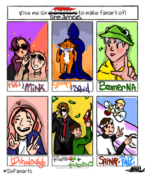 this was so entertaining to do!:D [people in the drawing left to right: Niki, Minx, Stampy, Squiddy, Boomer, LdShadowlady, Ranboo, Tubbo, Sapnap, and Punz] #SixFanarts #mcytfanart #justaminxfanart -> rts are cool, REMEBER TO UNTAG PLS:D