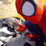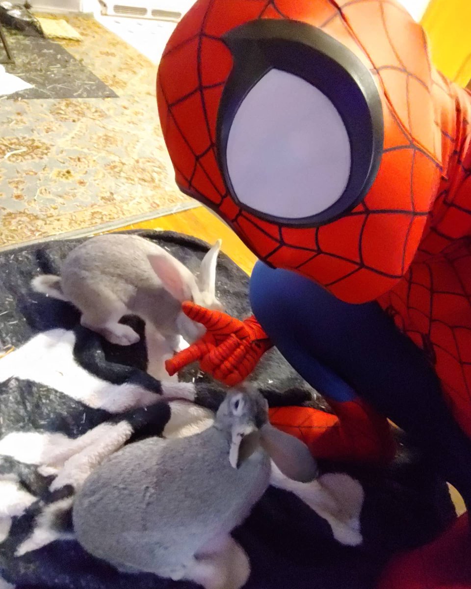 Just a web-head hanging with his bunny buddy! Spidey suit by @spidey4fun #SpiderMan #cosplay #rabbit #flemishgiant #ThunderandDoom #bunnies #cosplayer #spidey