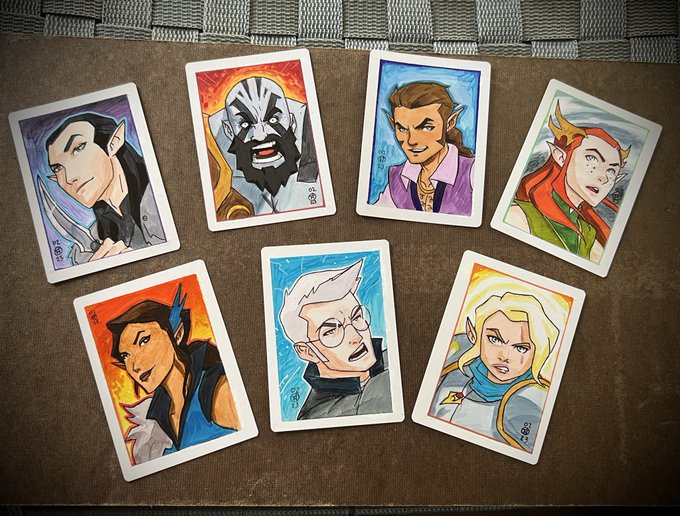 Alright, y’all! Here’s the entire set of Vox Machina sketches on the backs my DND Secret Lair Artist Proofs. You can pick them up on my Whatnot stream this afternoon at 1:30 Central. Link is below. #CriticalRoleArt #mtg #dnd #criticalrole