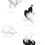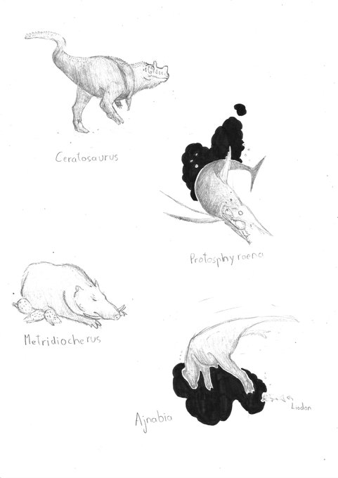 Results from the #paleostream! Ceratosaurus, Protosphyraena, Metridiochoerus and Ajnabia #paleoart #dinosaurs #pigs #fish #sketches #sciart