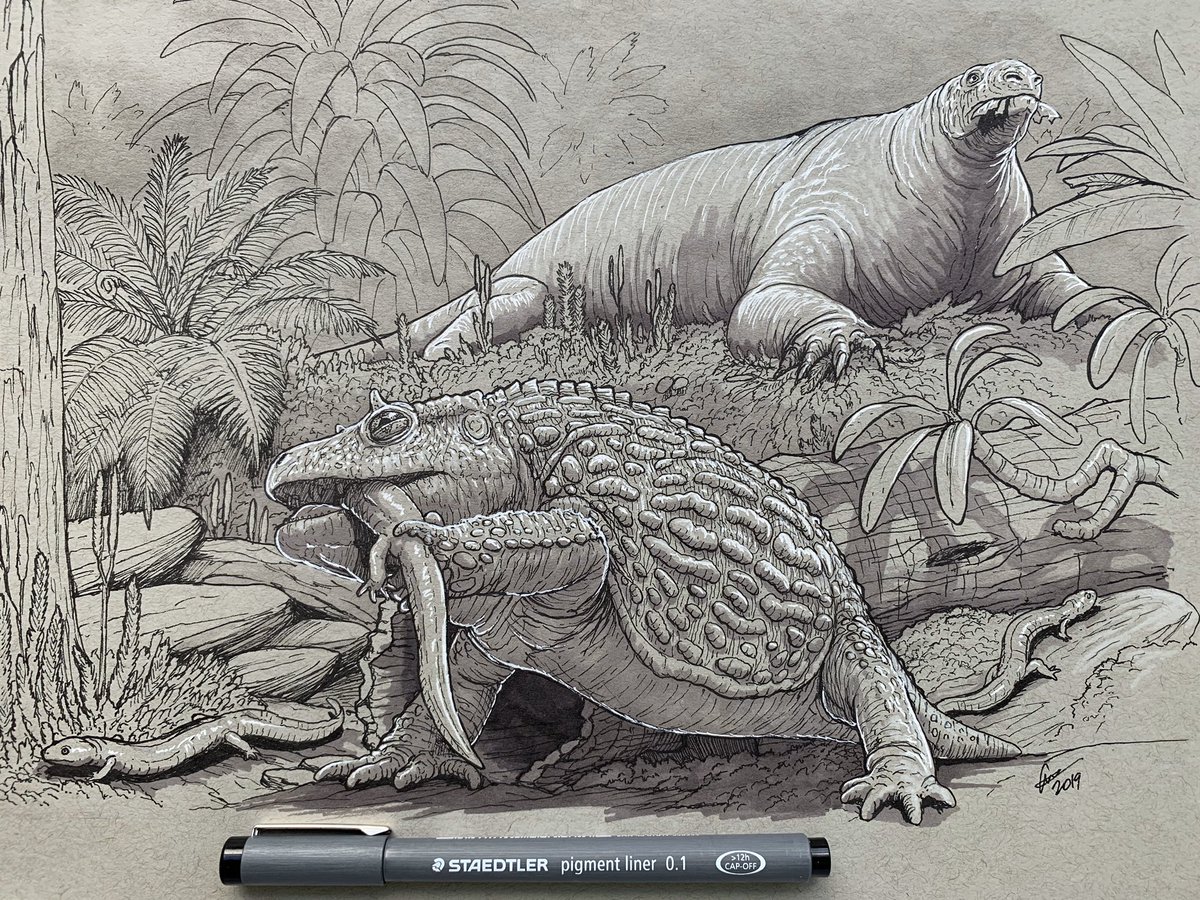 #inktoberday5 Cacops, a dissorophoid Temnospondyl, eats a microsaur while the small headed caseid synapsid Oromycter munches on some leaves in the background. Early Permian of North America. Spent more time than usual on this one #Paleoart #sciart #inktober #inktober2019