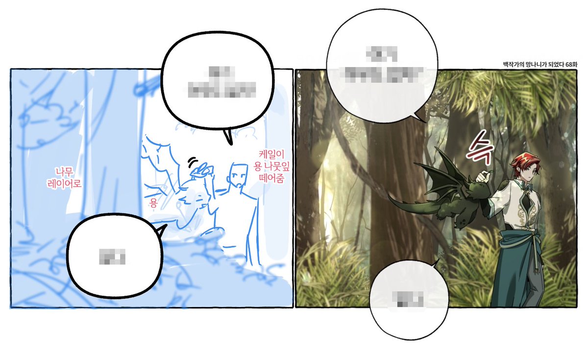 <백작가의 망나니가 되었다> 시즌2 콘티 작업물들 몇 점 올려봅니다. 용용이(?) 나뭇잎 떼 주는 상황은 제가 임의로 추가한 건데 좋아해 주는 분들이 많아서 뿌듯했어요.😊 page.kakao.com/home?seriesId=…