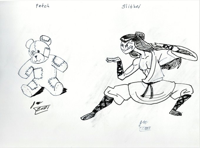 Day 29: Patch Patching up a bear plush wouldn't be bad as long if you don't overdo it. Day 30: Slither The snake fighter shall slither his fist to overpower his opponents. #inktober2021 #inktober
