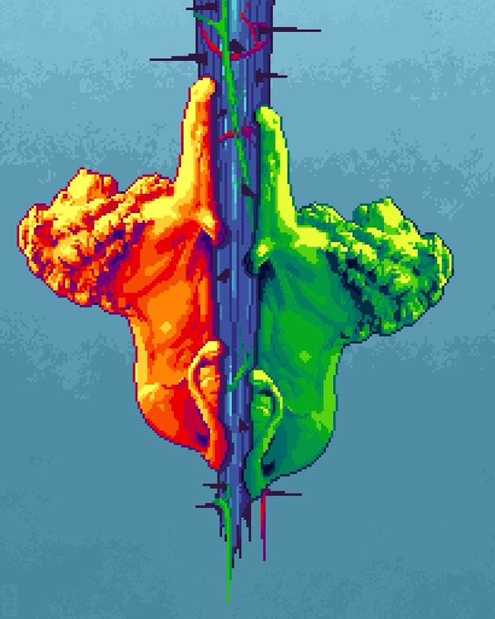 #experimental - object segmentation (RVOS) and pixelation (RevGAN and custom scripts). Mixed with #handdrawn #pixelart. Composed in #aseprite. #experiment #mathart #generativeart #generative #deeplearning #pixel #digitalArt #retro #lion #cat #sciencefiction #colorful #psychedelic
