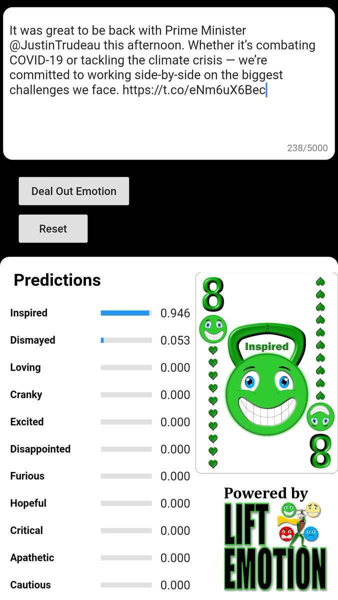 @POTUS @JustinTrudeau A natural language processing app predicts the expressed emotion in the tweet. #NLP #NLProc #App #Startup #ML #UX #EQ #EmotionAI #Deeplearning #IoT #Machinelearning #Sentiment #Neuroscience #Data #technofanart