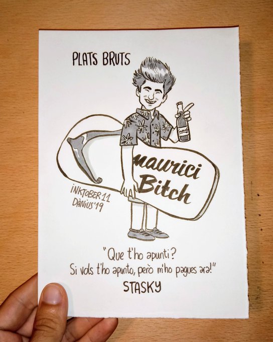 Avui toca dibuix/retrat del personatge Stasky: No sabia si dibuixar-lo al darrere de la barra del bar Maurici o no... i al final he optat per fer-lo amb la xancleta/cartell del capítol "tinc ritme". I el cacaolat, que no falti! #inktoberday11 #inktober2019 #ink #platsbruts