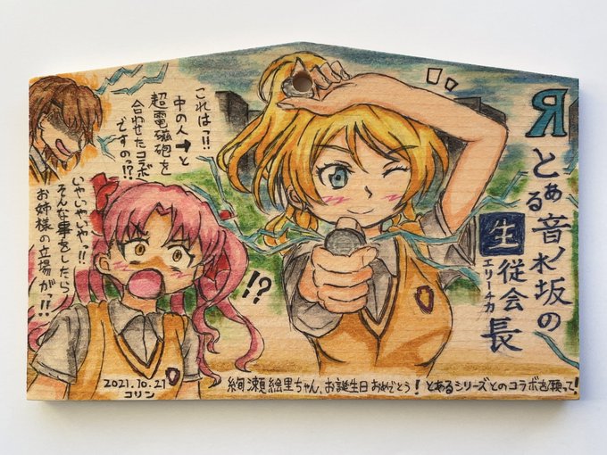 10/21はμ's.絢瀬絵里ちゃんの誕生日!中の人はfripSide。名曲『only my railgun』の流れで、とあるシリーズの御坂美琴. 白井黒子を合わせて神田明神の絵馬に描きました。お誕生日おめでとう!(・∀・) #lovelive #μsicforever #絢瀬絵里生誕祭2021 #とある