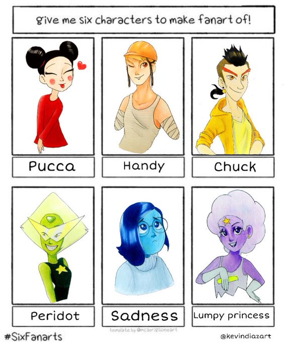 1. Pucca - Pucca 2. Handy - Happy tree friends 3. Chuck - Angry birds 4. Peridot - Steven universe 5. Tristeza - intensamente 6. Princesa grumosa - hora de aventura Otros 6 personajes de #SixFanarts #SixFanartsChallenge #stevenuniversefanart
