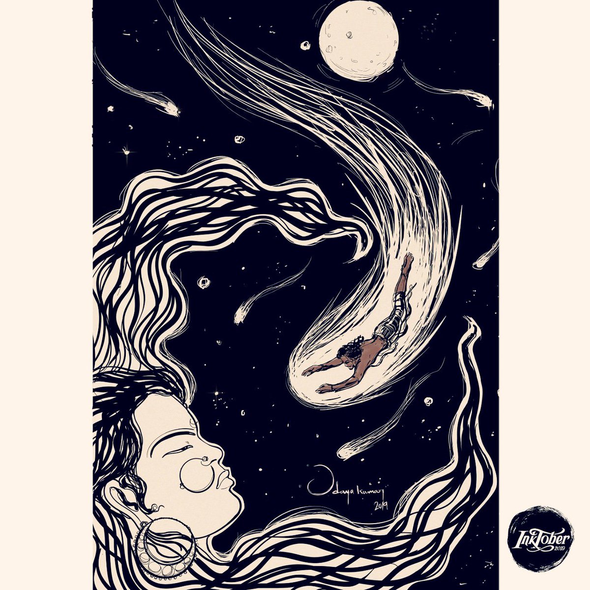 #inktober #inktober2019 -Day 2 'Mindless' திருக்குறள் - காமத்துப்பால் மதியும் மடந்தை முகனும் அறியா பதியின் கலங்கிய மீன். (குறள் 1116) The stars perplexed are rushing wildly from their spheres; For like another moon this maiden's face appears. #thirukural #kamathupal #tamil