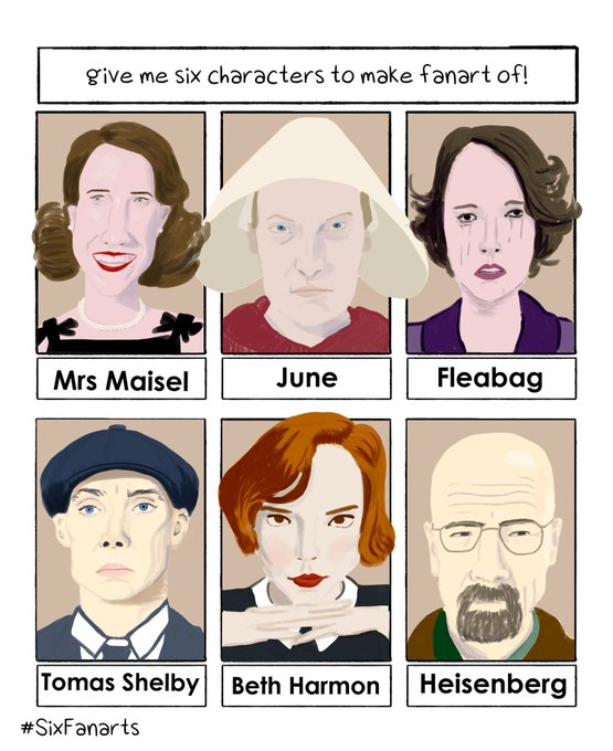 6 series que vi en el último año y recomiendo a todo el mundo🤗 Hecho todo con Photoshop #art #drawing #illustration #photoshop #sixfanarts #sixfanartschallenge #sixfanart #mrsmaisel #handmaid #fleabag #peakyblinders #queensgambit #brakingbad