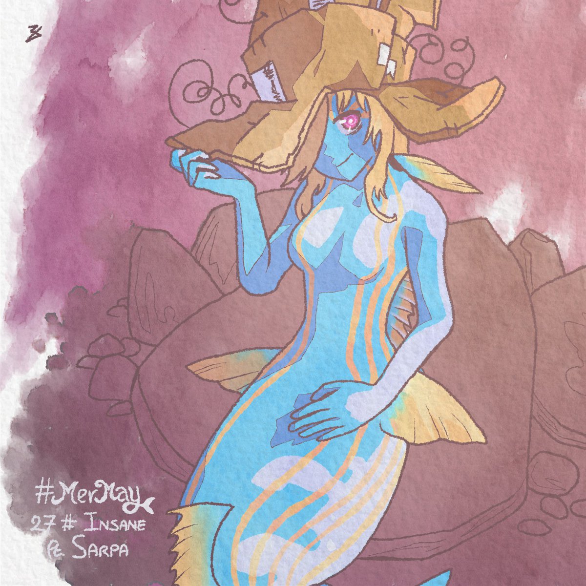 Day 27 - We finally have a look to the mermaid called Aislinn, and old seawitch called crazy by her peers. However, those that buy from her might be called crazy... #mermay #mermay2021 #watercolors #insane More info + Diary entry: deviantart.com/thesigmaarts/a…