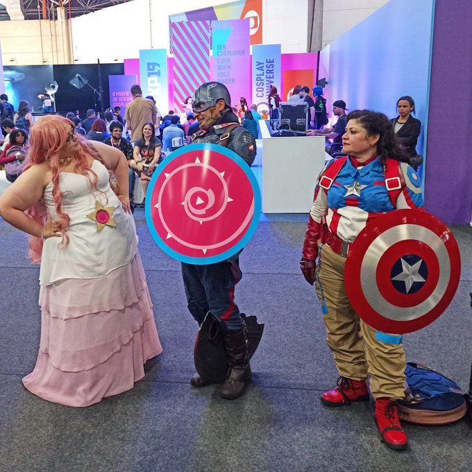 Capitão América, será que você poderia devolver meu escudo?!? . . Crossover de dois mundos onde a arma principal é o escudo 🤩 #ccxp2019 #capitaoamerica #stevenuniverso #crossover #cosplay
